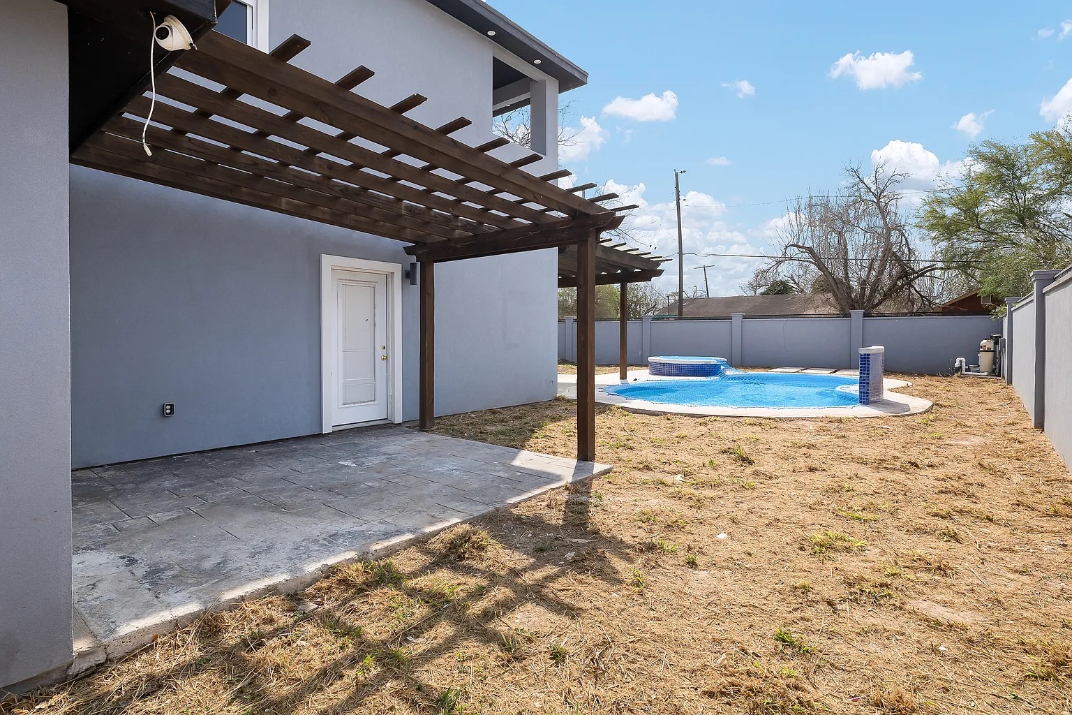 This modern-style home delivers standout curb appeal and a backyard designed for effortless entertaining. The sleek contemporary exterior is paired with a 2-car garage and a bright, functional layout featuring 3 bedrooms and 2.5 bathrooms. Out back, the showstopper yard offers a pool with a raised spa, expansive concrete decking, and a large covered pergola complete with a built-in outdoor kitchen and bar. Fully enclosed by a privacy wall, this space creates your own private retreat. Property sold "as-is". Buyer and/or buyer's agent responsible for verifying all pertinent information deemed relevant by the prospective buyer, including but not limited to square footage, acreage, utilities, taxes, zoning, permitting, condition, school zones, HOAs, etc.