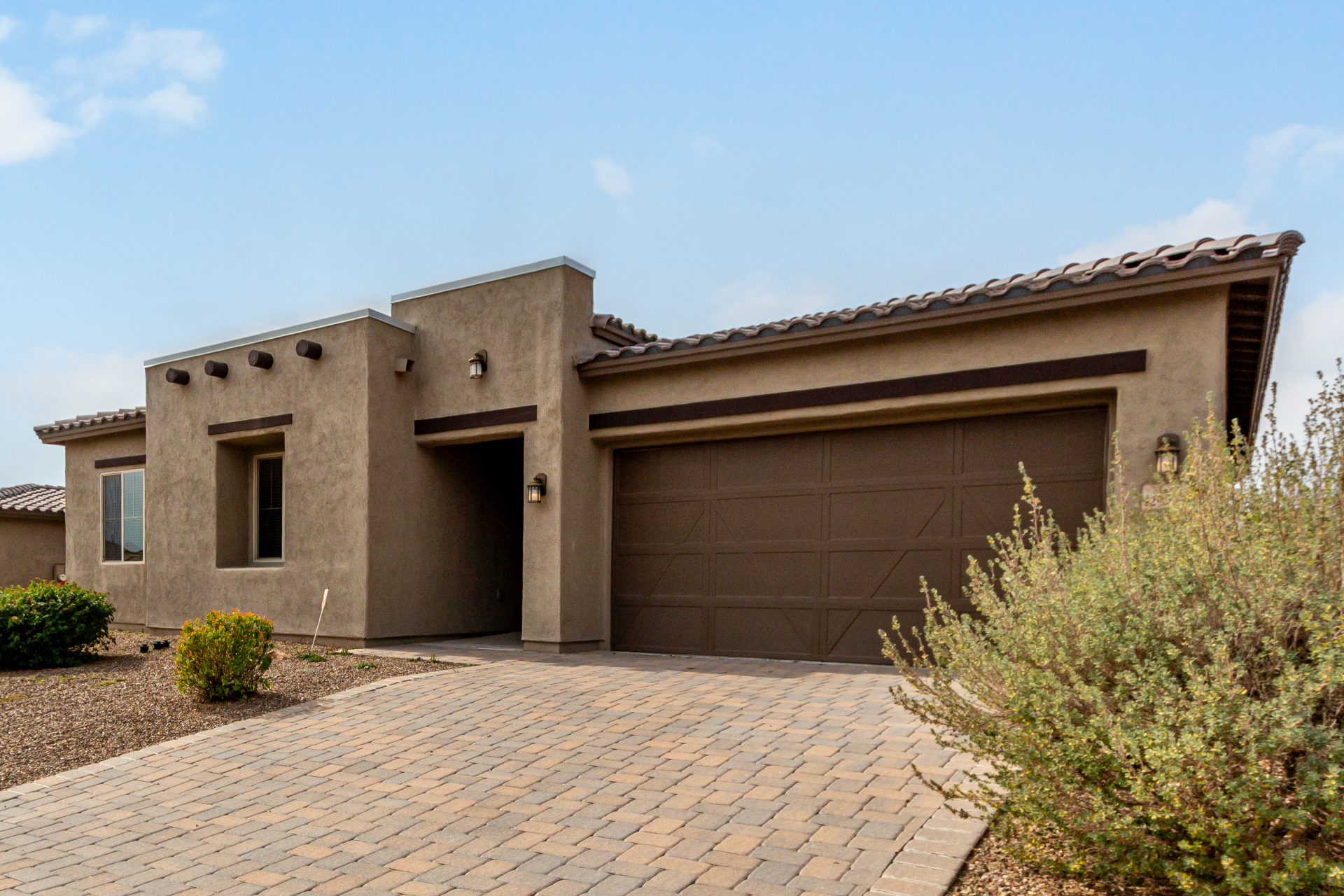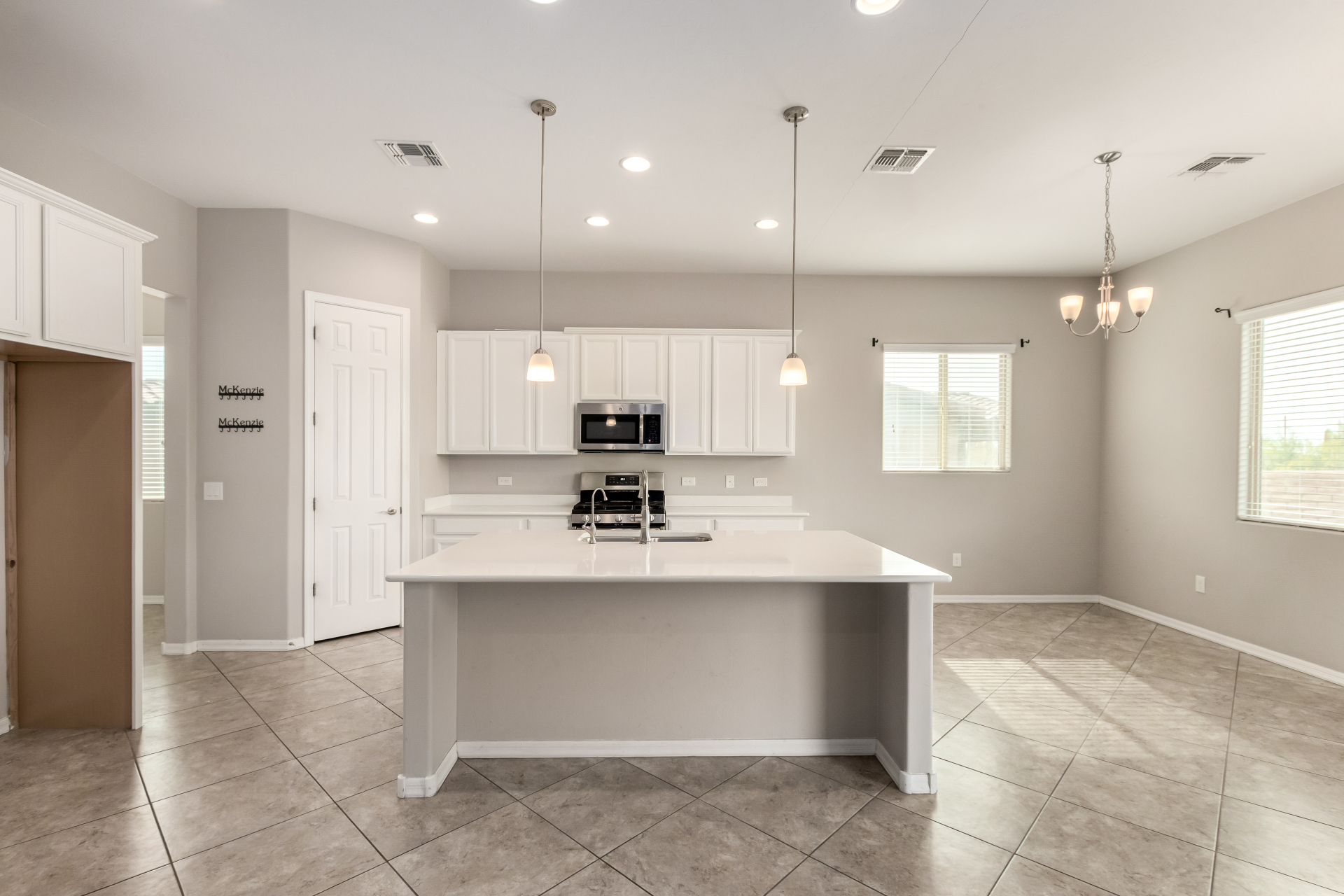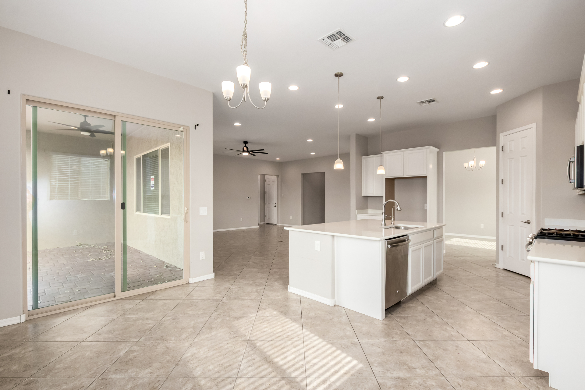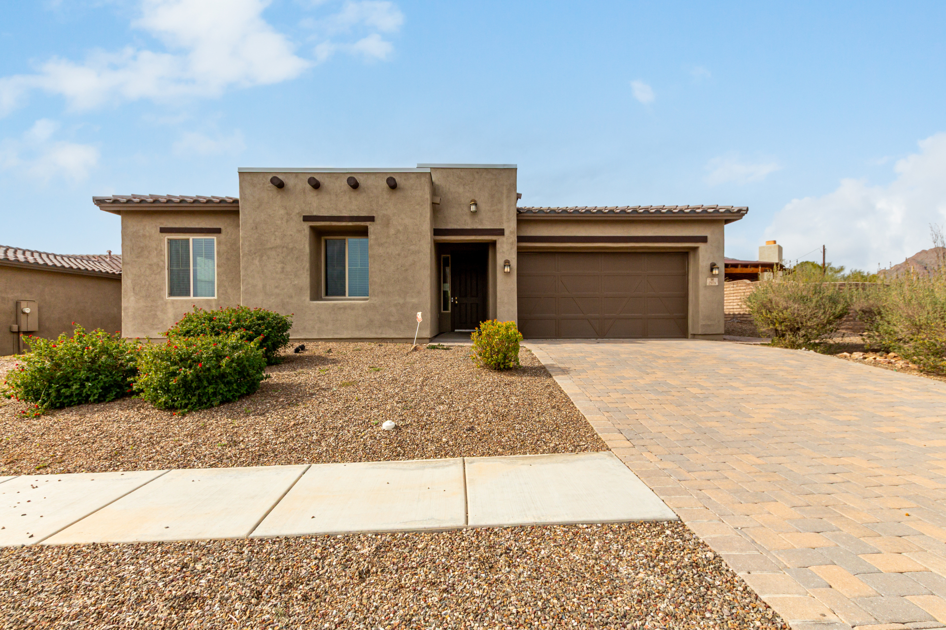 Enjoy effortless single-level living in this beautifully crafted ranch-style new home, perfectly situated just steps from the community pool. The thoughtfully designed kitchen features rich maple cabinetry, quartz countertops, recessed lighting, stainless steel appliances, and a generous walk-in pantry—ideal for both everyday living and entertaining. A charming breakfast nook opens to a spacious great room that seamlessly extends to a relaxing covered patio, perfect for indoor-outdoor enjoyment. This home offers three inviting bedrooms, including a luxurious primary suite complete with dual sinks, elegant quartz countertops, marble accents, and a stunning walk-in shower. A large walk-in closet with custom shelving adds both style and functionality. Additional highlights include soaring 10-foot ceilings, 8-foot doors throughout, and a paver-stone driveway and walkway, all combining to create a refined yet comfortable living experience.