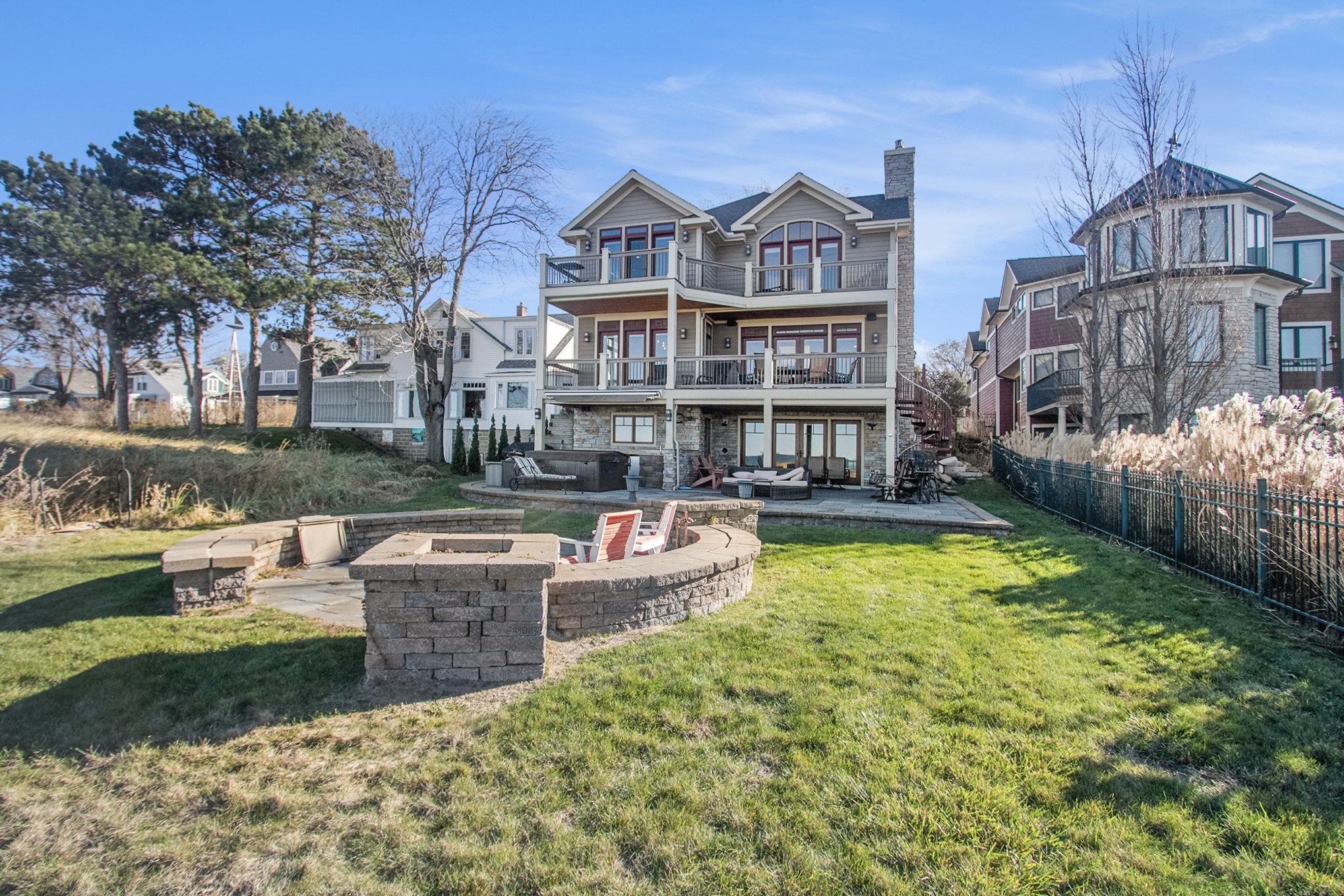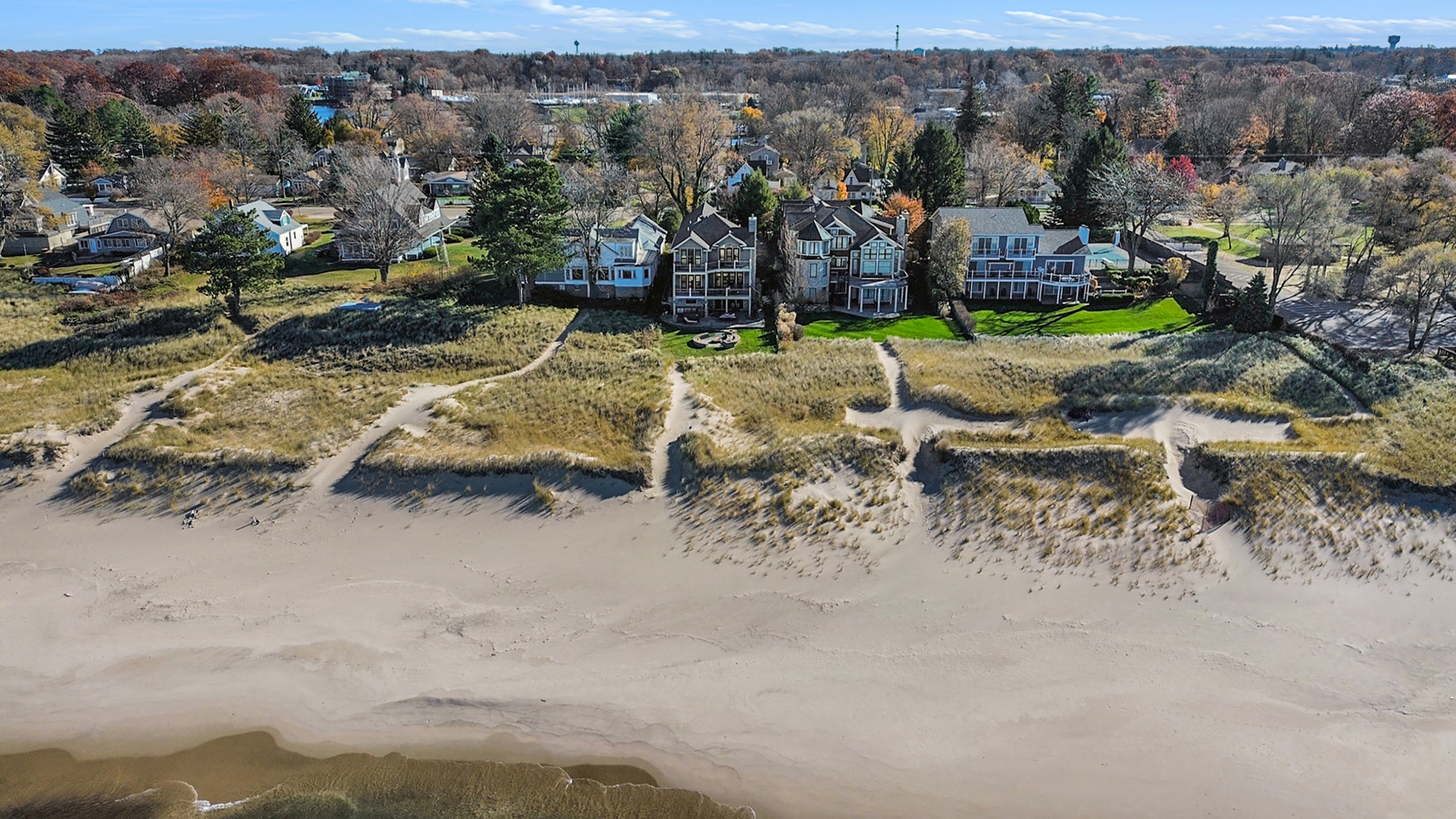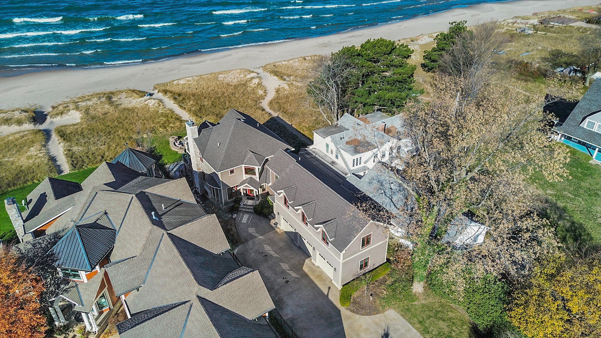 Discover timeless lakefront living in this traditional-style Lake Michigan retreat, perfectly set on a breathtaking stretch of shoreline with direct beach access. Designed for both comfort and sophistication, this spacious home offers sun-filled interiors, generous gathering spaces, and panoramic water views throughout. The main floor welcomes you with abundant natural light, a well-appointed kitchen with ample workspace, a cozy den, and both a full and half bathroom for added convenience. Multiple access points lead to two inviting decks, a large patio, and an impressive outdoor firepit, creating seamless indoor-outdoor living and the ideal backdrop for lakefront entertaining. Upstairs, the top floor features three comfortable bedrooms, four bathrooms, and a stunning bonus room. The partially finished walkout basement adds even more versatility with an additional bedroom, bathroom, and easy access to the outdoors, ideal for guests or extended stays. Several fireplaces warm the home with classic charm, while the three-car garage and extended driveway offer exceptional parking and storage. With unmatched lake frontage, generous living space, a layout designed for relaxation and connection, and located within walking distance of South Haven's shops and restaurants, this property embodies the best of lakeside living on Lake Michigan. Property sold "As-is".Buyer and/or buyer's agent responsible for verifying all pertinent information deemed relevant by the prospective buyer, including but not limited to square footage, acreage, utilities, taxes, zoning, permitting, condition, school zones, HOAs, etc.