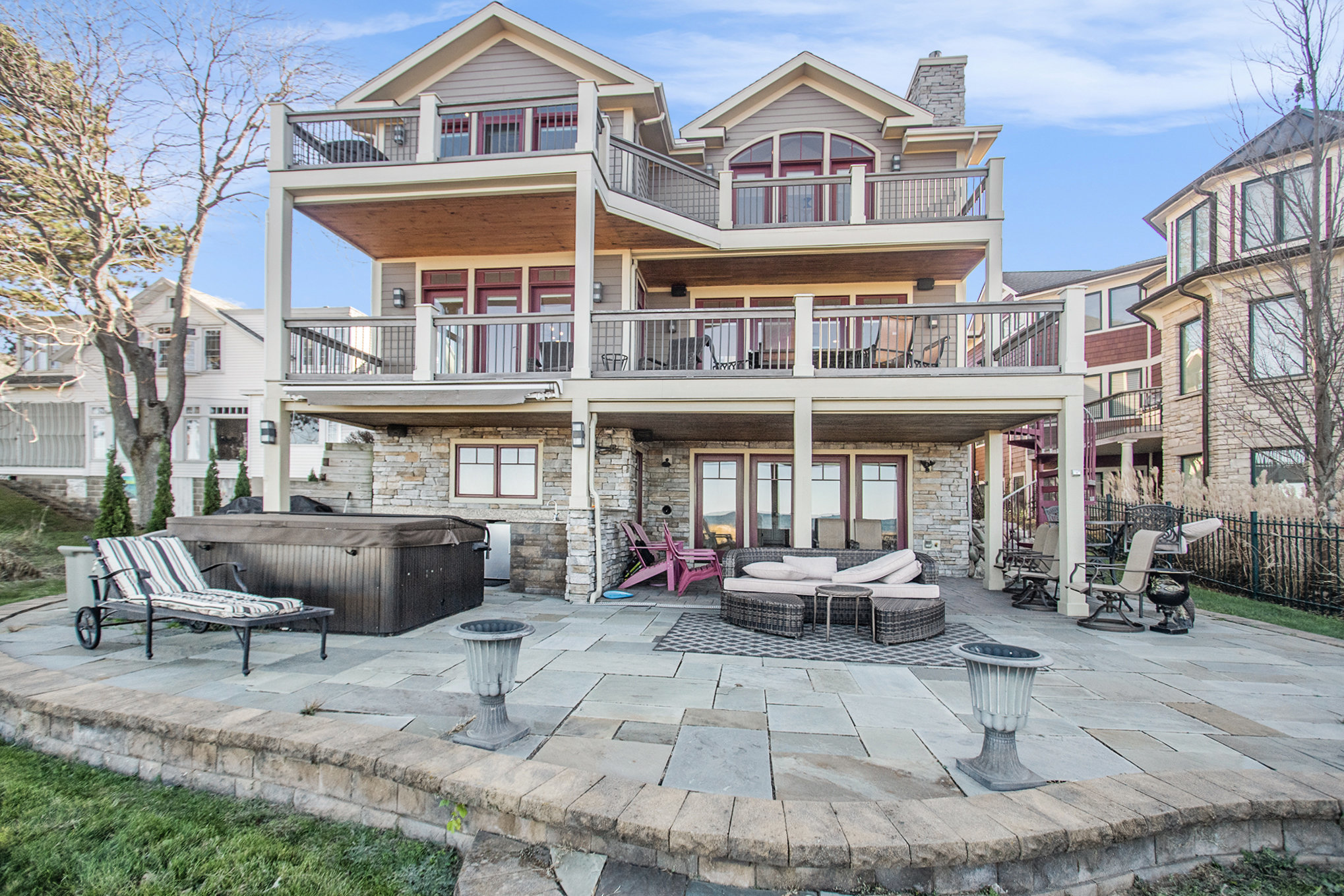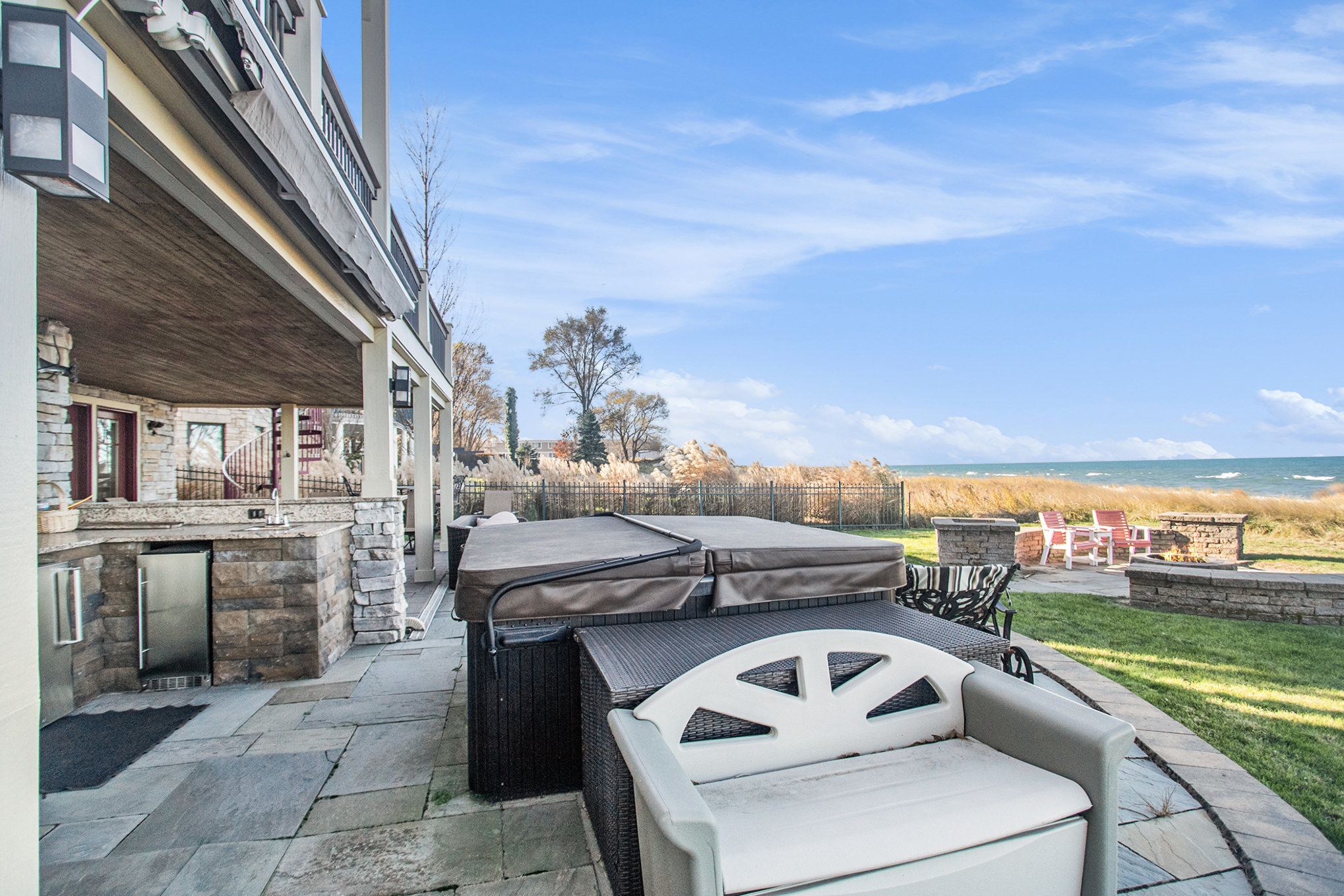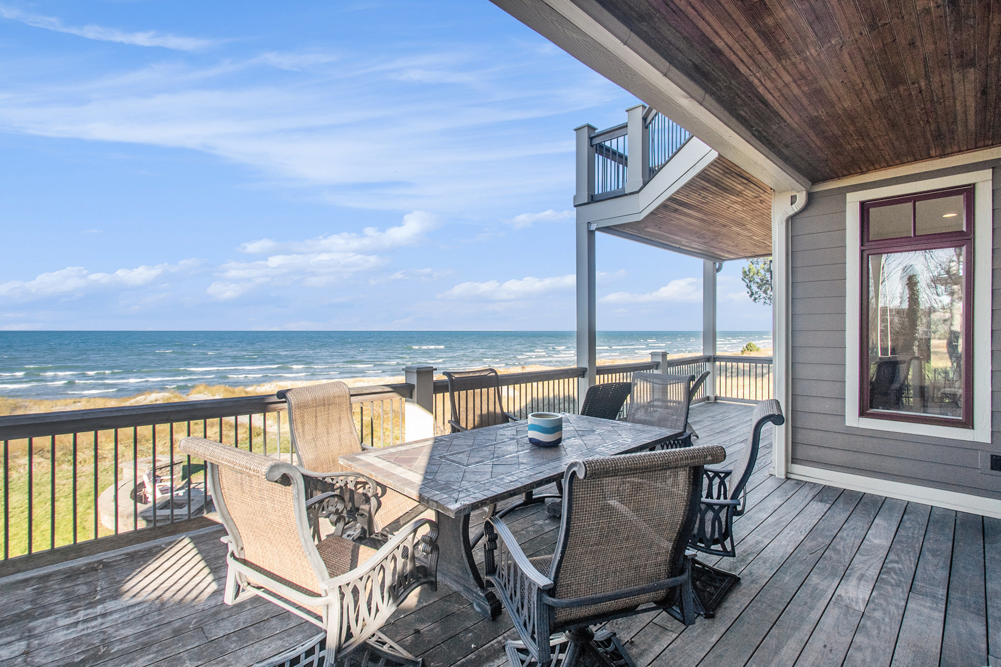 Discover timeless lakefront living in this traditional-style Lake Michigan retreat, perfectly set on a breathtaking stretch of shoreline with direct beach access. Designed for both comfort and sophistication, this spacious home offers sun-filled interiors, generous gathering spaces, and panoramic water views throughout. The main floor welcomes you with abundant natural light, a well-appointed kitchen with ample workspace, a cozy den, and both a full and half bathroom for added convenience. Multiple access points lead to two inviting decks, a large patio, and an impressive outdoor firepit, creating seamless indoor-outdoor living and the ideal backdrop for lakefront entertaining. Upstairs, the top floor features three comfortable bedrooms, four bathrooms, and a stunning bonus room. The partially finished walkout basement adds even more versatility with an additional bedroom, bathroom, and easy access to the outdoors, ideal for guests or extended stays. Several fireplaces warm the home with classic charm, while the three-car garage and extended driveway offer exceptional parking and storage. With unmatched lake frontage, generous living space, a layout designed for relaxation and connection, and located within walking distance of South Haven's shops and restaurants, this property embodies the best of lakeside living on Lake Michigan. Property sold "As-is".Buyer and/or buyer's agent responsible for verifying all pertinent information deemed relevant by the prospective buyer, including but not limited to square footage, acreage, utilities, taxes, zoning, permitting, condition, school zones, HOAs, etc.