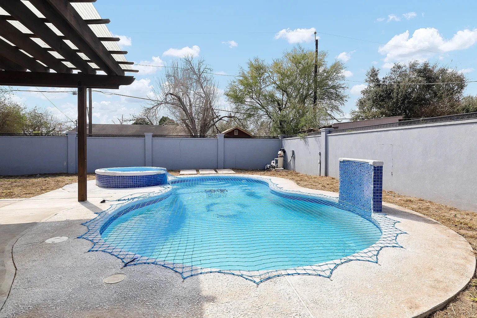 This modern-style home delivers standout curb appeal and a backyard designed for effortless entertaining. The sleek contemporary exterior is paired with a 2-car garage and a bright, functional layout featuring 3 bedrooms and 2.5 bathrooms. Out back, the showstopper yard offers a pool with a raised spa, expansive concrete decking, and a large covered pergola complete with a built-in outdoor kitchen and bar. Fully enclosed by a privacy wall, this space creates your own private retreat. Property sold "as-is". Buyer and/or buyer's agent responsible for verifying all pertinent information deemed relevant by the prospective buyer, including but not limited to square footage, acreage, utilities, taxes, zoning, permitting, condition, school zones, HOAs, etc.