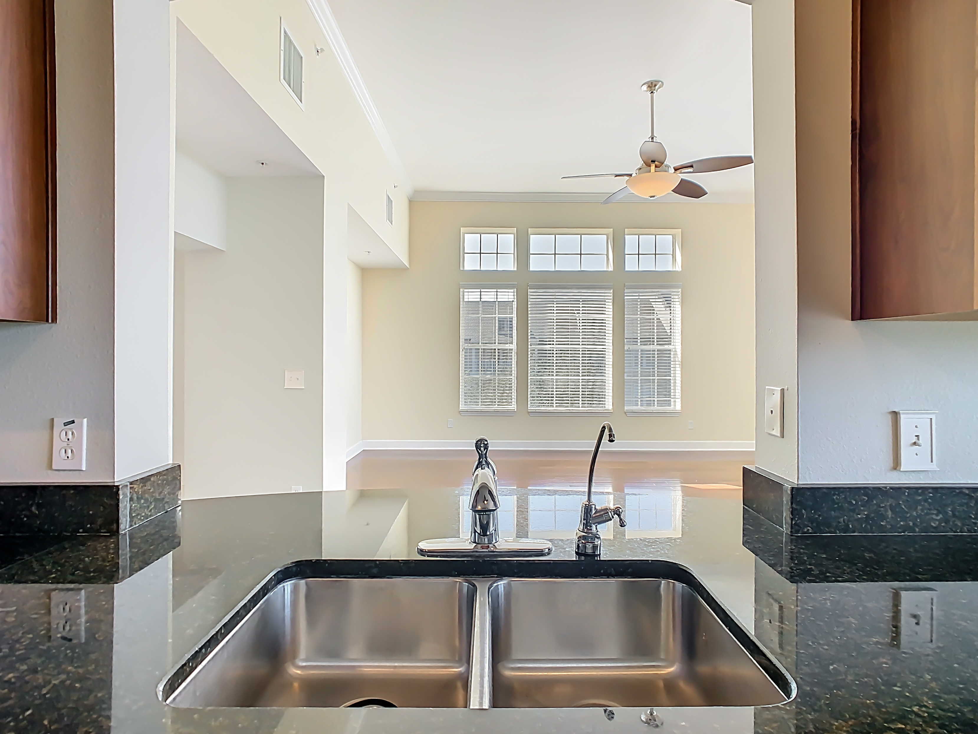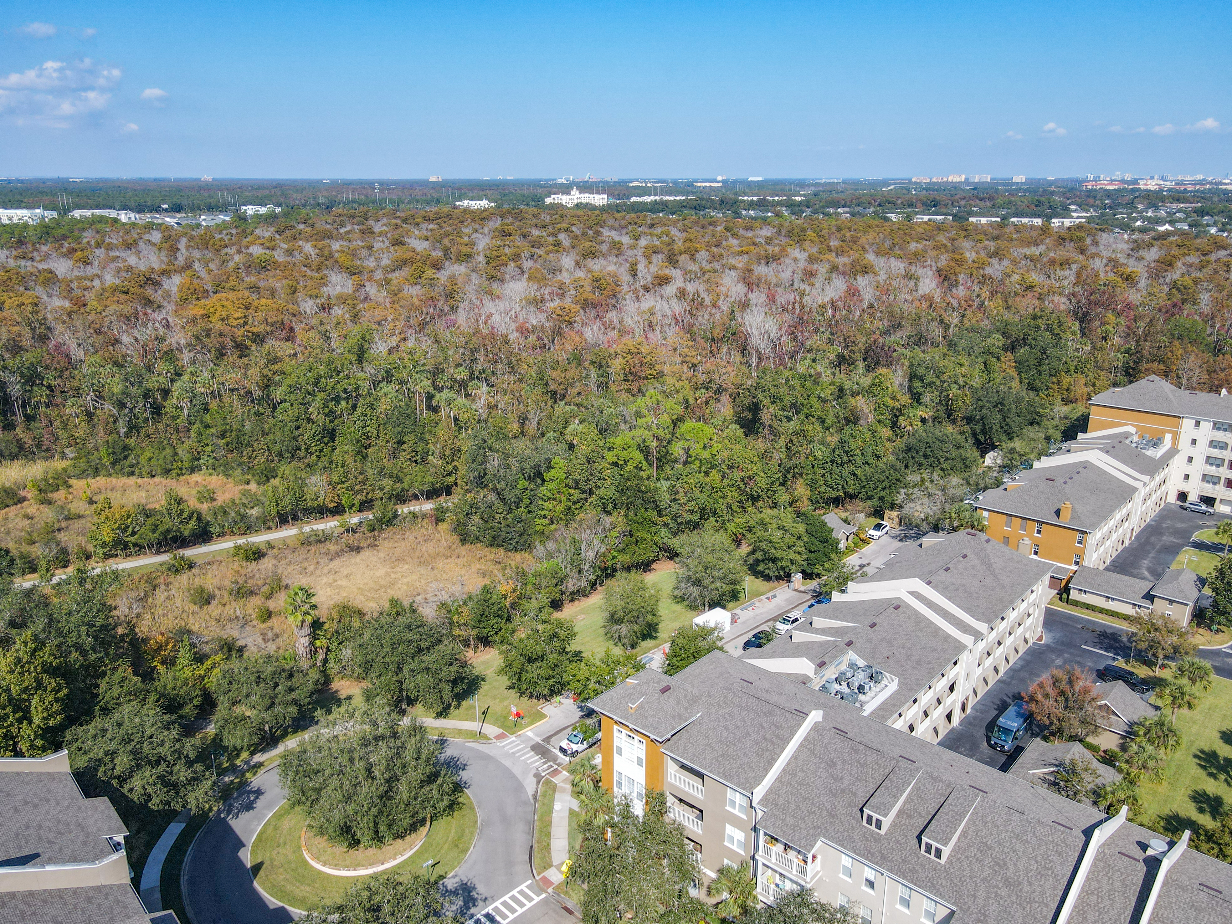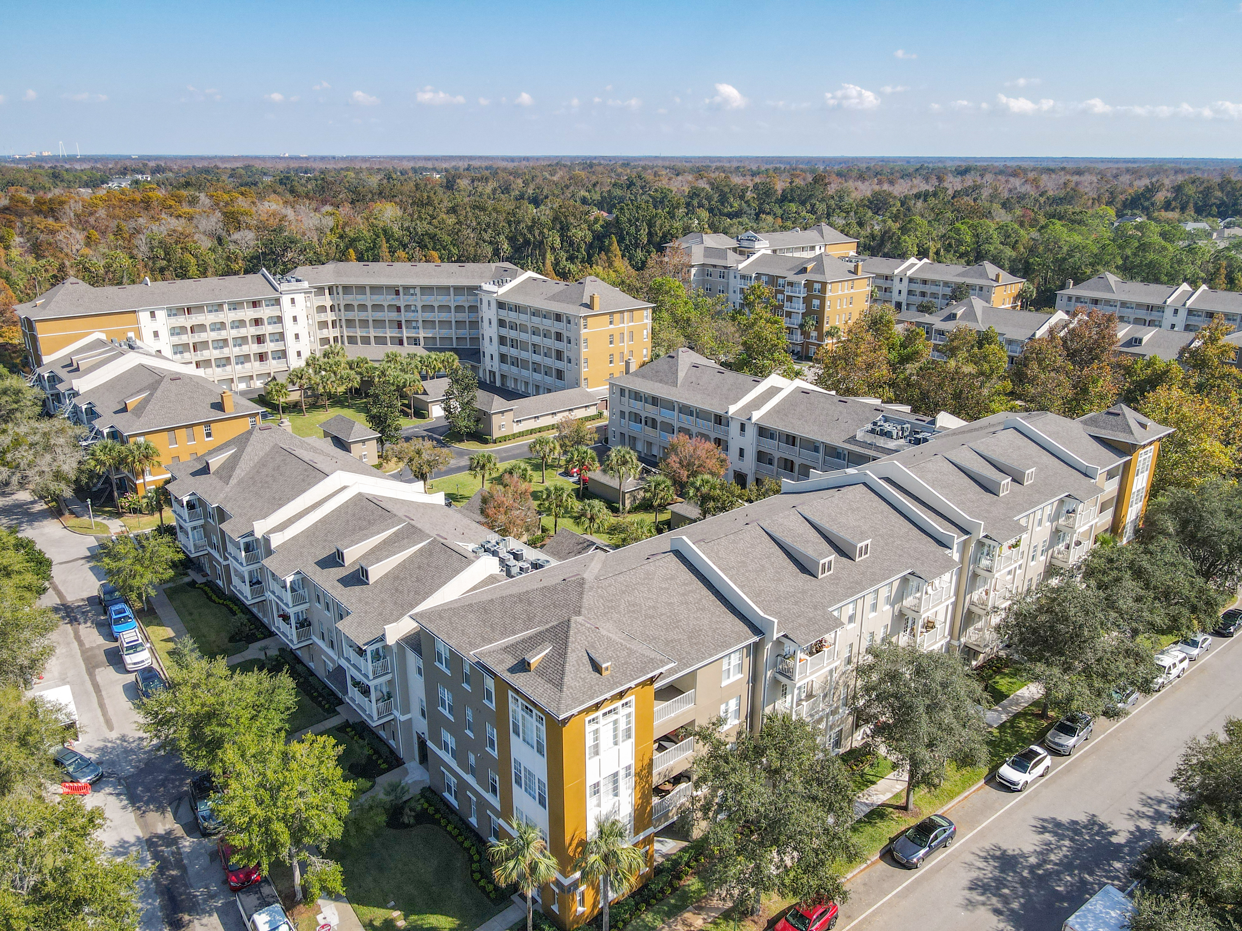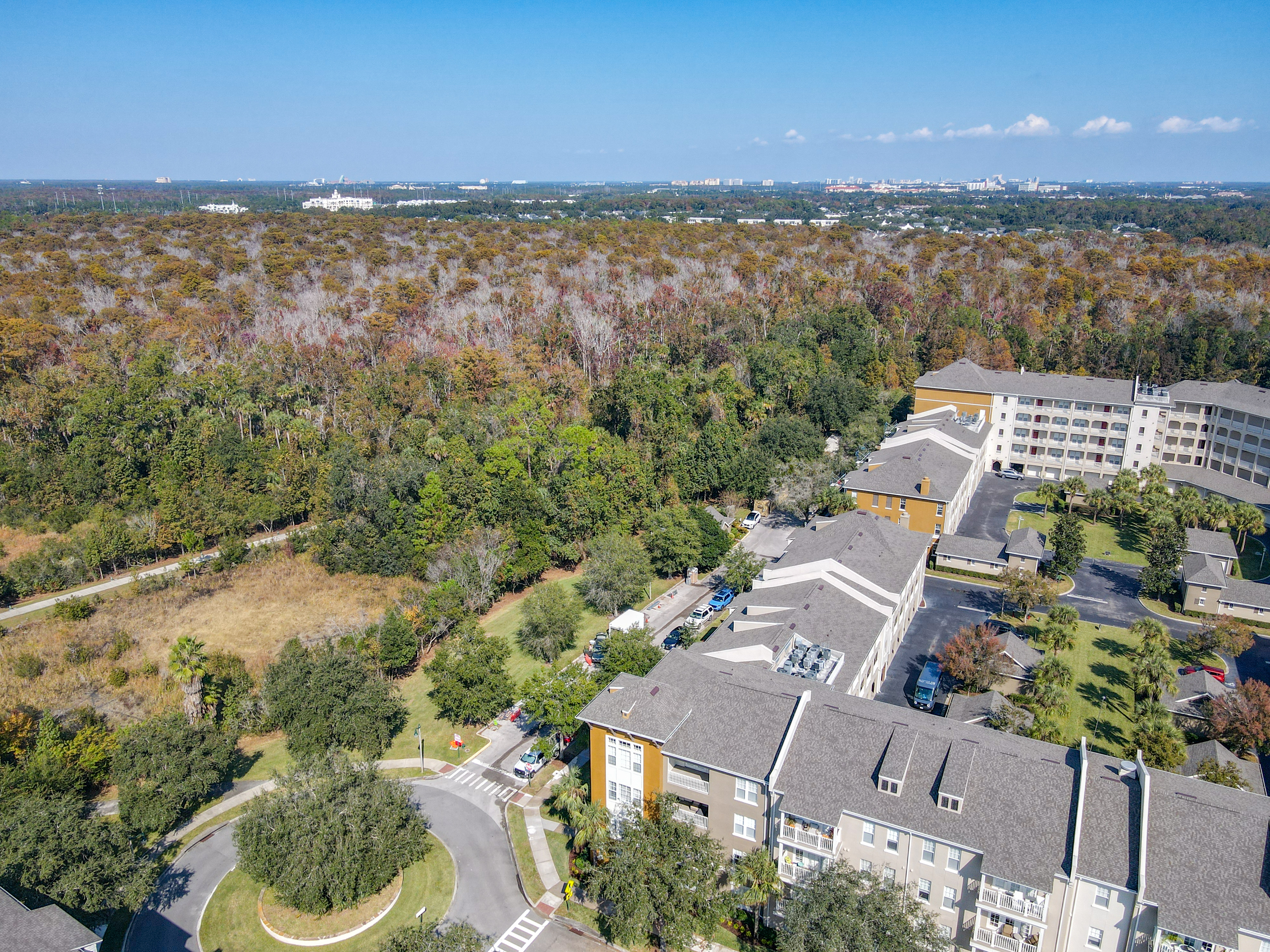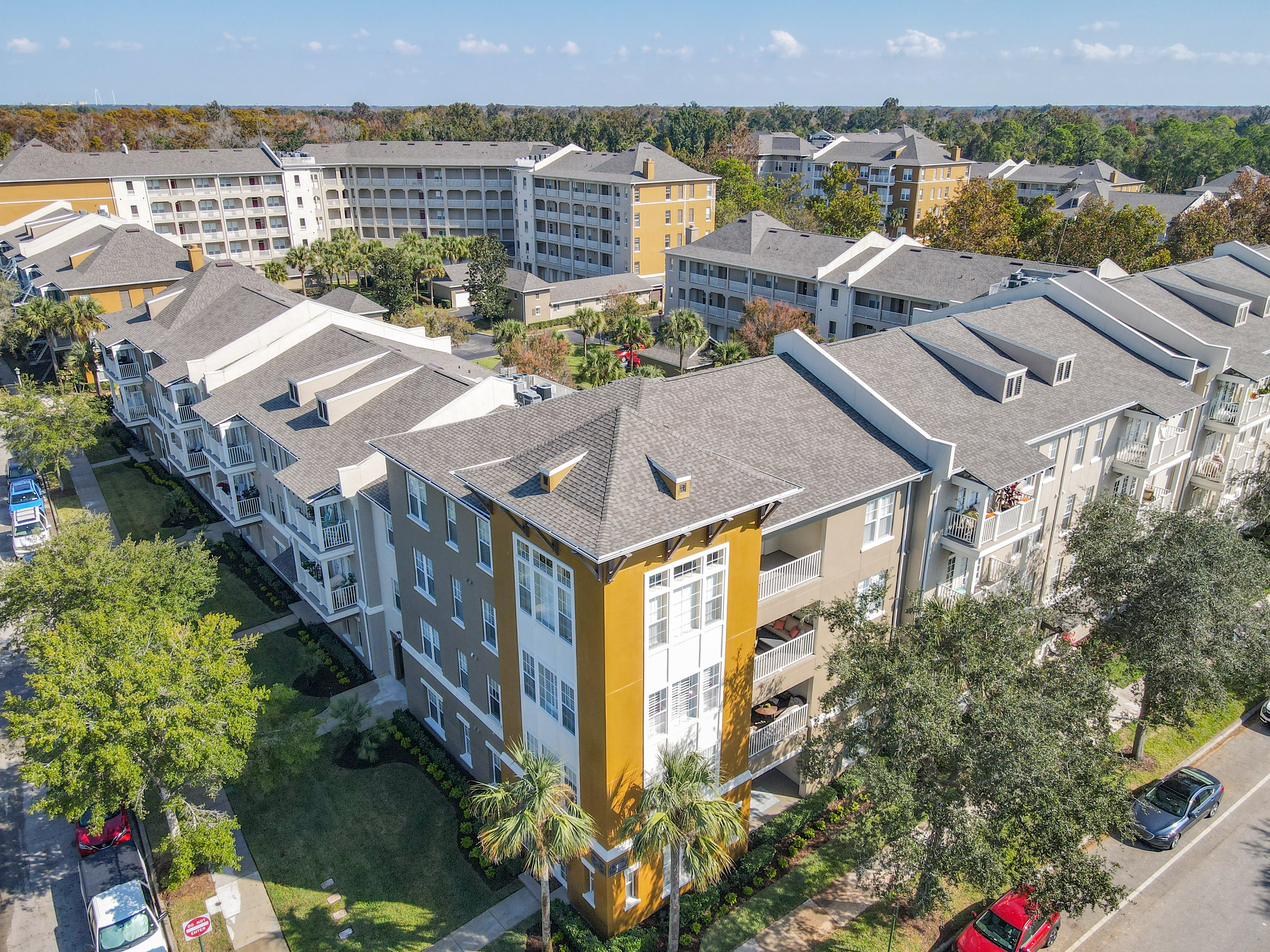 Available NOW in Celebration, Florida! City views from the balcony, treetop views from the living room, volume ceilings, plentiful windows and a corner unit location are included in this 4th Floor residence. The foyer opens into a generous sized formal dining space; complete with a wall of windows opening to the covered balcony. In true split floor plan style, two bedrooms share a jack-and-jill bath on the opposite side of the dining room. The galley kitchen includes an eat-in space and pass through with snack bar into the living room, along with a closet pantry. A half bathroom for guests is tucked away near the kitchen. In this same hallway is a laundry room with utility sink. Situated away from the main living areas is the primary bedroom. A generous walk-in closet along with en-suite bathroom make up the owner's retreat. There's also a den/office located behind French doors right off the foyer, too. Amenities abound, including a pool and fitness center. Nearby are coffee shops, restaurants, grocery stores, movie theatres, a post office, parks and walking trails. In addition, this unit is assigned single car garage bay G-10 and storage closet 11-B. Property sold "As-is". Buyer and/or buyer's agent responsible for verifying all pertinent information deemed relevant by the prospective buyer, including but not limited to square footage, acreage, utilities, taxes, zoning, permitting, condition, school zones, HOAs, etc.