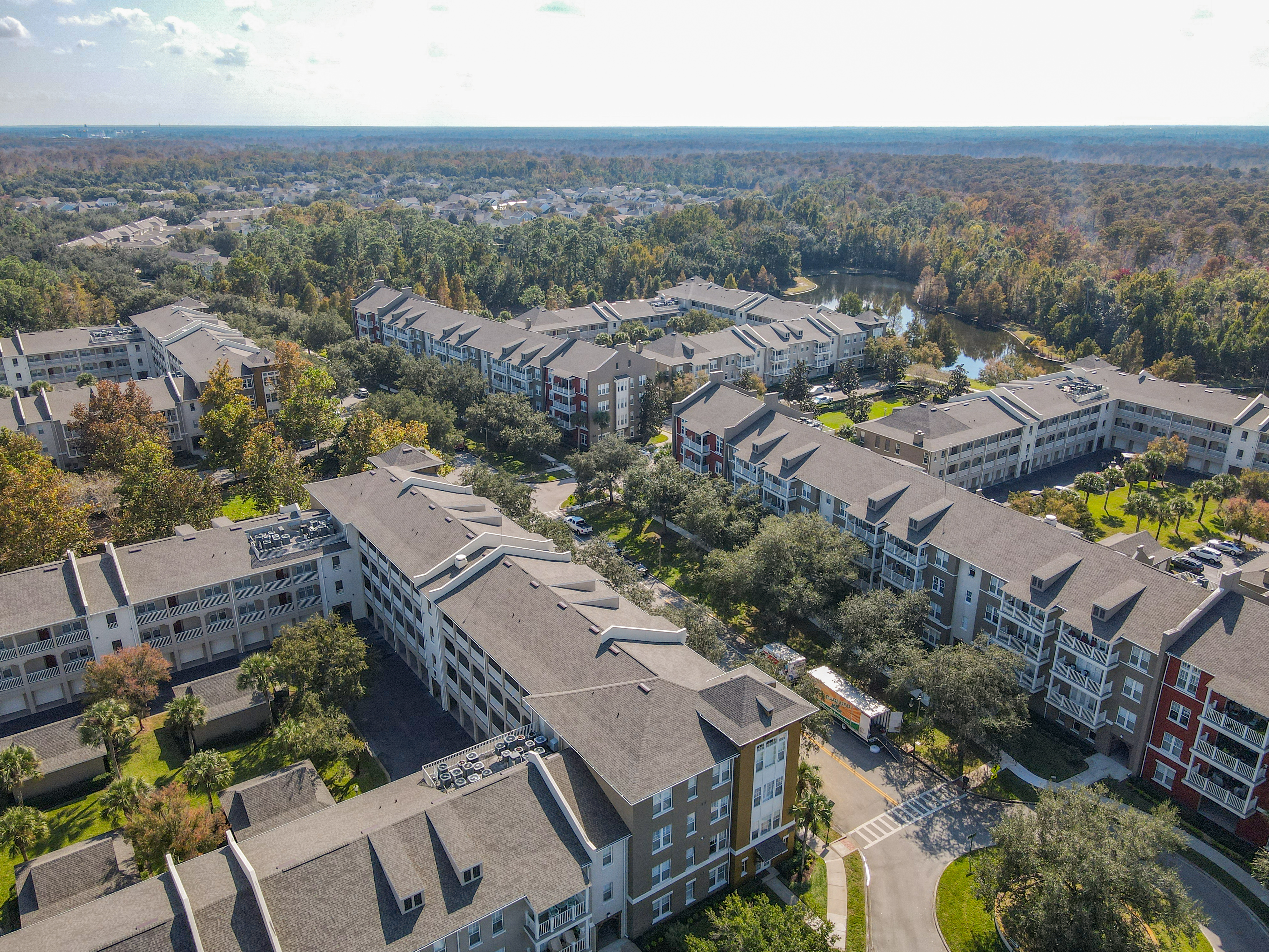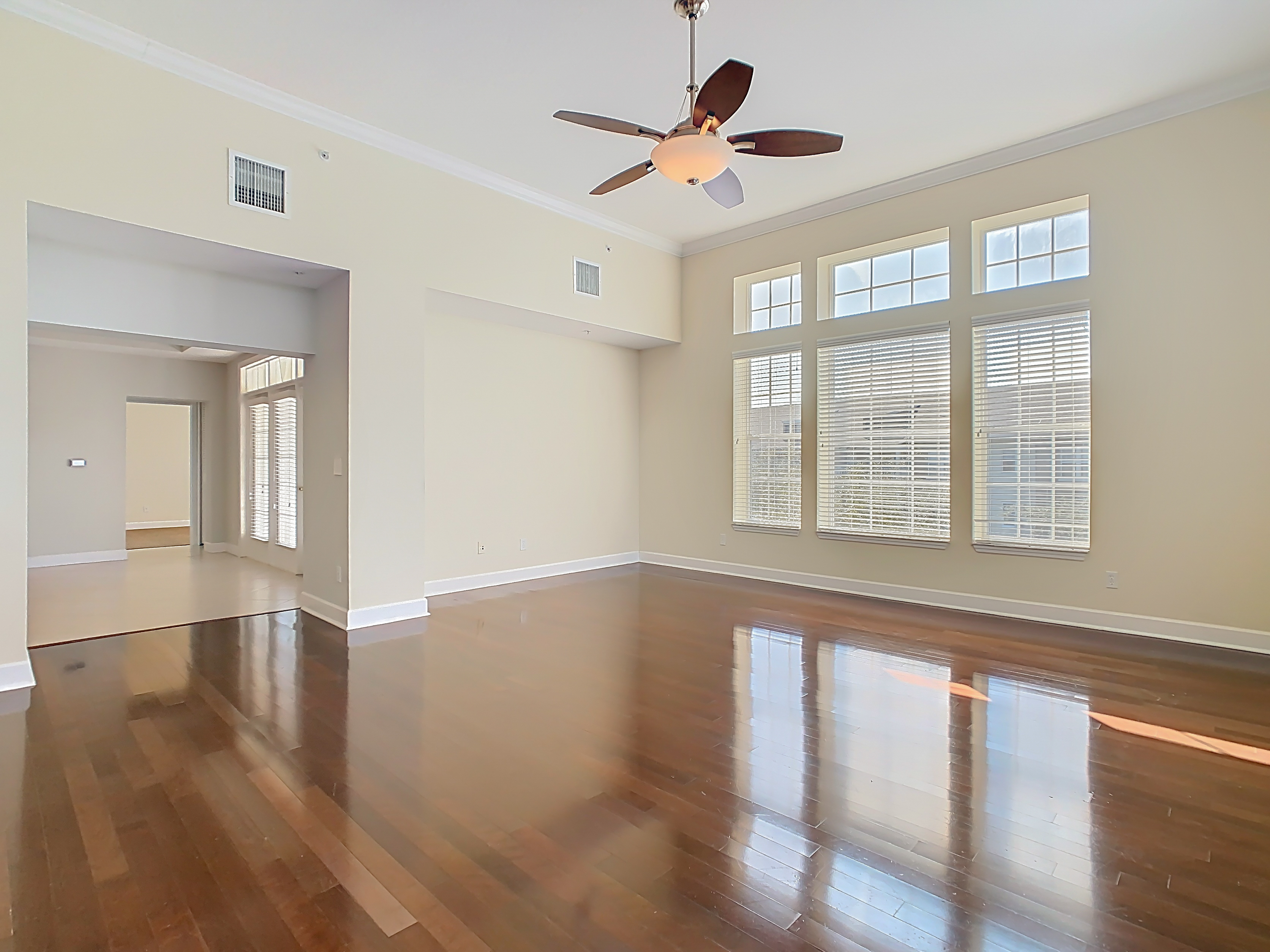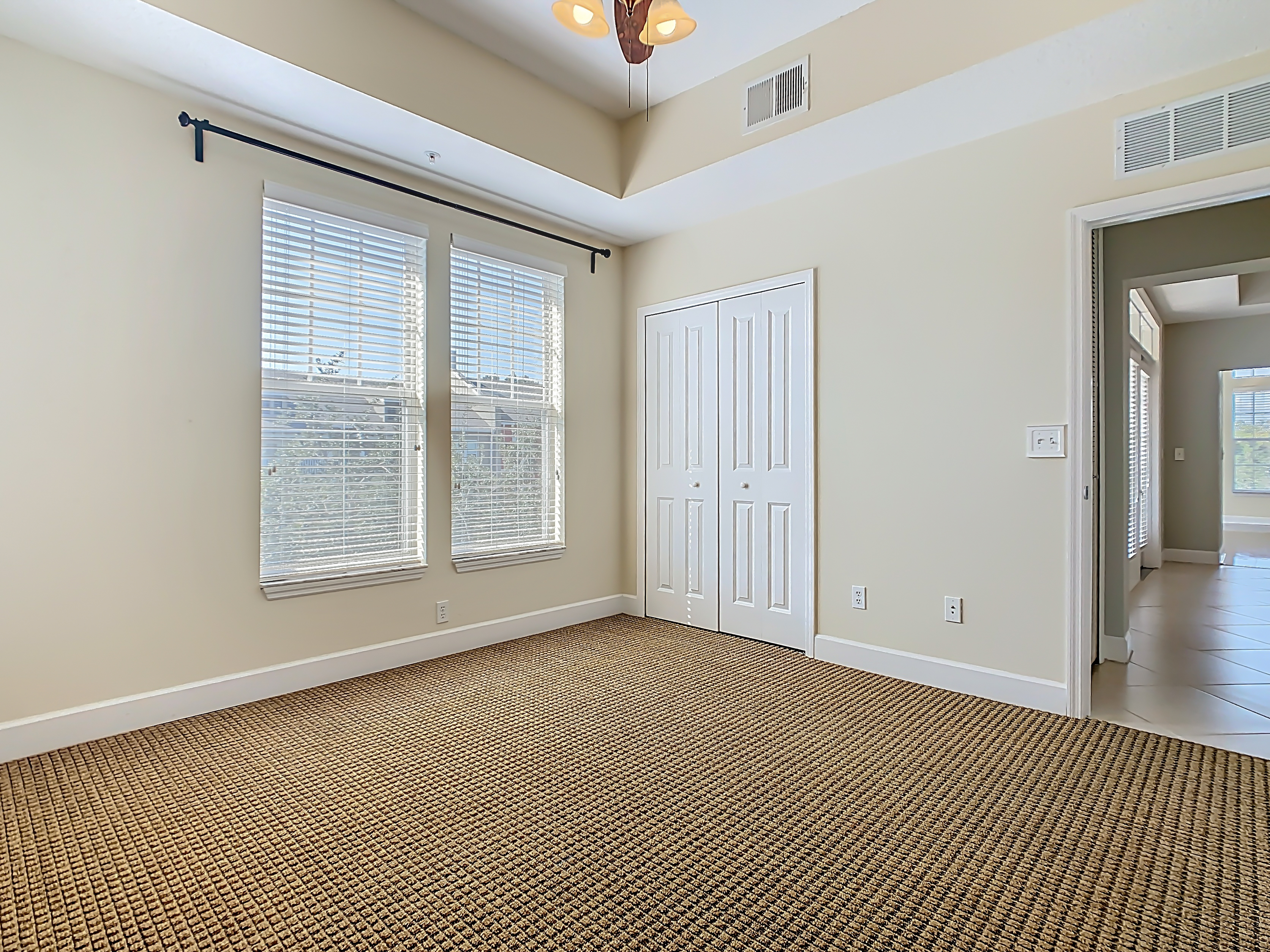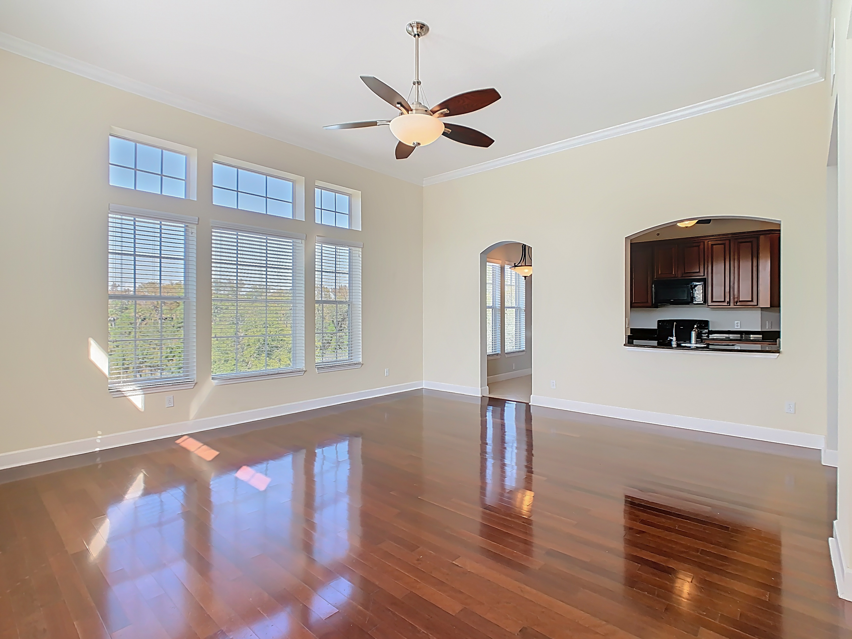 Available NOW in Celebration, Florida! City views from the balcony, treetop views from the living room, volume ceilings, plentiful windows and a corner unit location are included in this 4th Floor residence. The foyer opens into a generous sized formal dining space; complete with a wall of windows opening to the covered balcony. In true split floor plan style, two bedrooms share a jack-and-jill bath on the opposite side of the dining room. The galley kitchen includes an eat-in space and pass through with snack bar into the living room, along with a closet pantry. A half bathroom for guests is tucked away near the kitchen. In this same hallway is a laundry room with utility sink. Situated away from the main living areas is the primary bedroom. A generous walk-in closet along with en-suite bathroom make up the owner's retreat. There's also a den/office located behind French doors right off the foyer, too. Amenities abound, including a pool and fitness center. Nearby are coffee shops, restaurants, grocery stores, movie theatres, a post office, parks and walking trails. In addition, this unit is assigned single car garage bay G-10 and storage closet 11-B. Property sold "As-is". Buyer and/or buyer's agent responsible for verifying all pertinent information deemed relevant by the prospective buyer, including but not limited to square footage, acreage, utilities, taxes, zoning, permitting, condition, school zones, HOAs, etc.